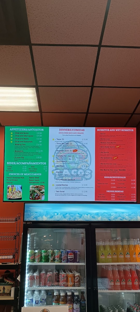 Rice, Beans. pork, beef, queso, cheese, chips.